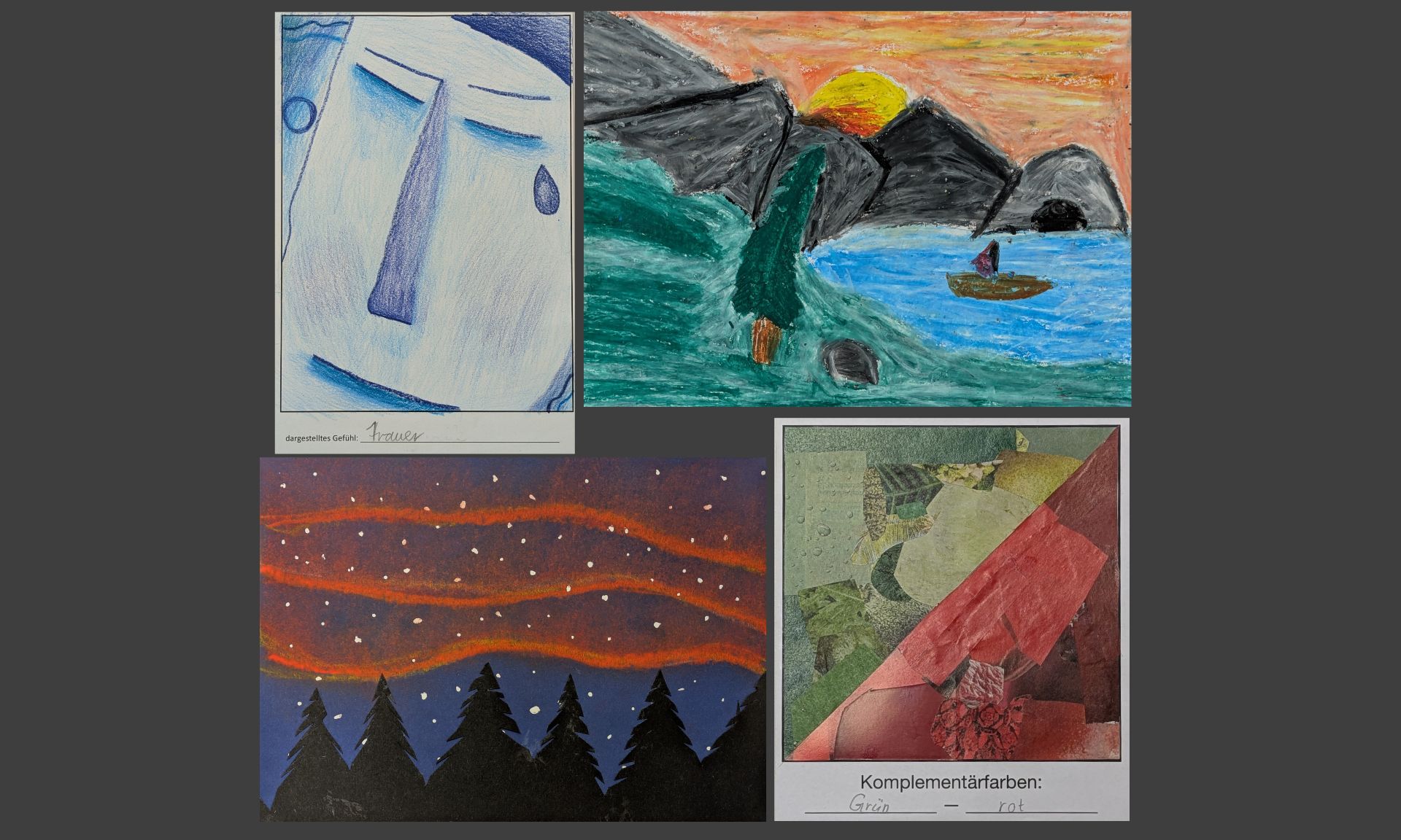 Die Schülerinnen und Schüler der Klasse 5c erstellten Farbhefte und gestalteten dafür jeweils vier Werke. Dabei setzten sie sich mit Farbkontrasten und Farbwirkungen auseinander, ließen